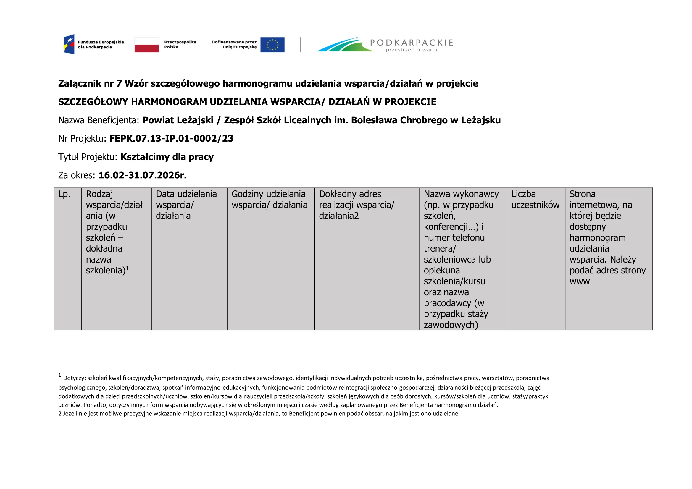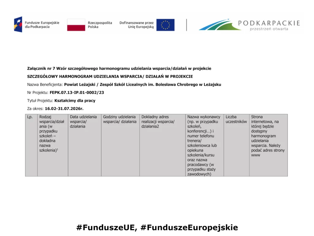 Harmonogram – „Staże uczniowskie i nauczycielskie u Partnera”
