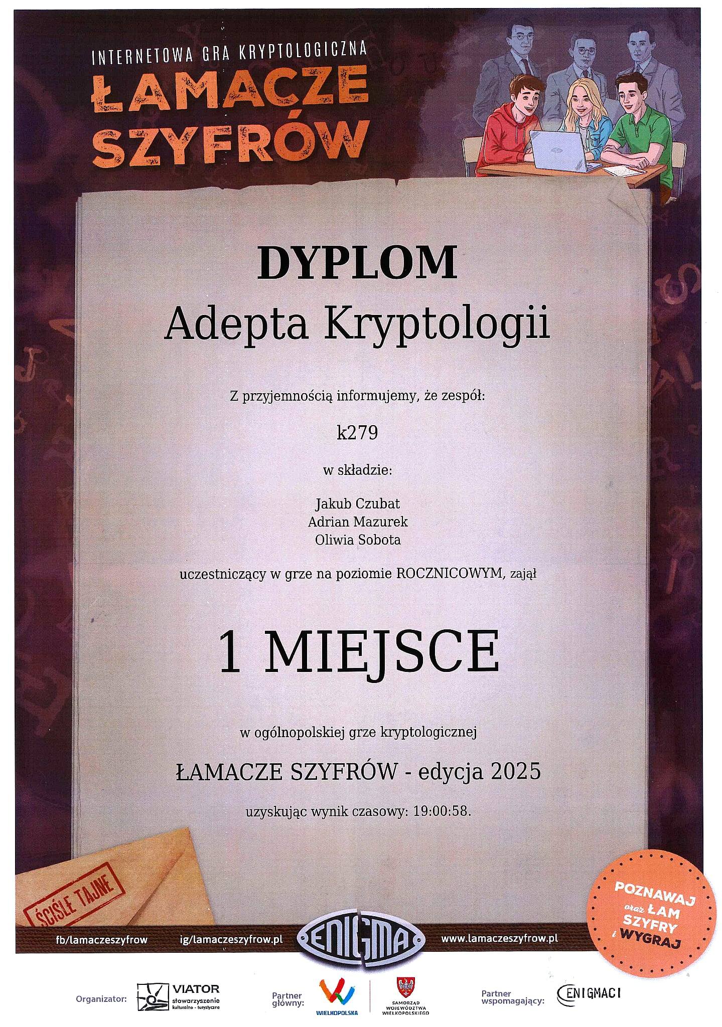 Z dumą informujemy, że drużyna w składzie Jakub Czubat, Oliwia Sobota oraz Adrian Mazurek – uczniowie klasy o profilu Cyberbezpieczeństwo i nowoczesne technologie informatyczne – odniosła spektakularny sukces w ogólnopolskim konkursie „Łamacze Szyfrów”!