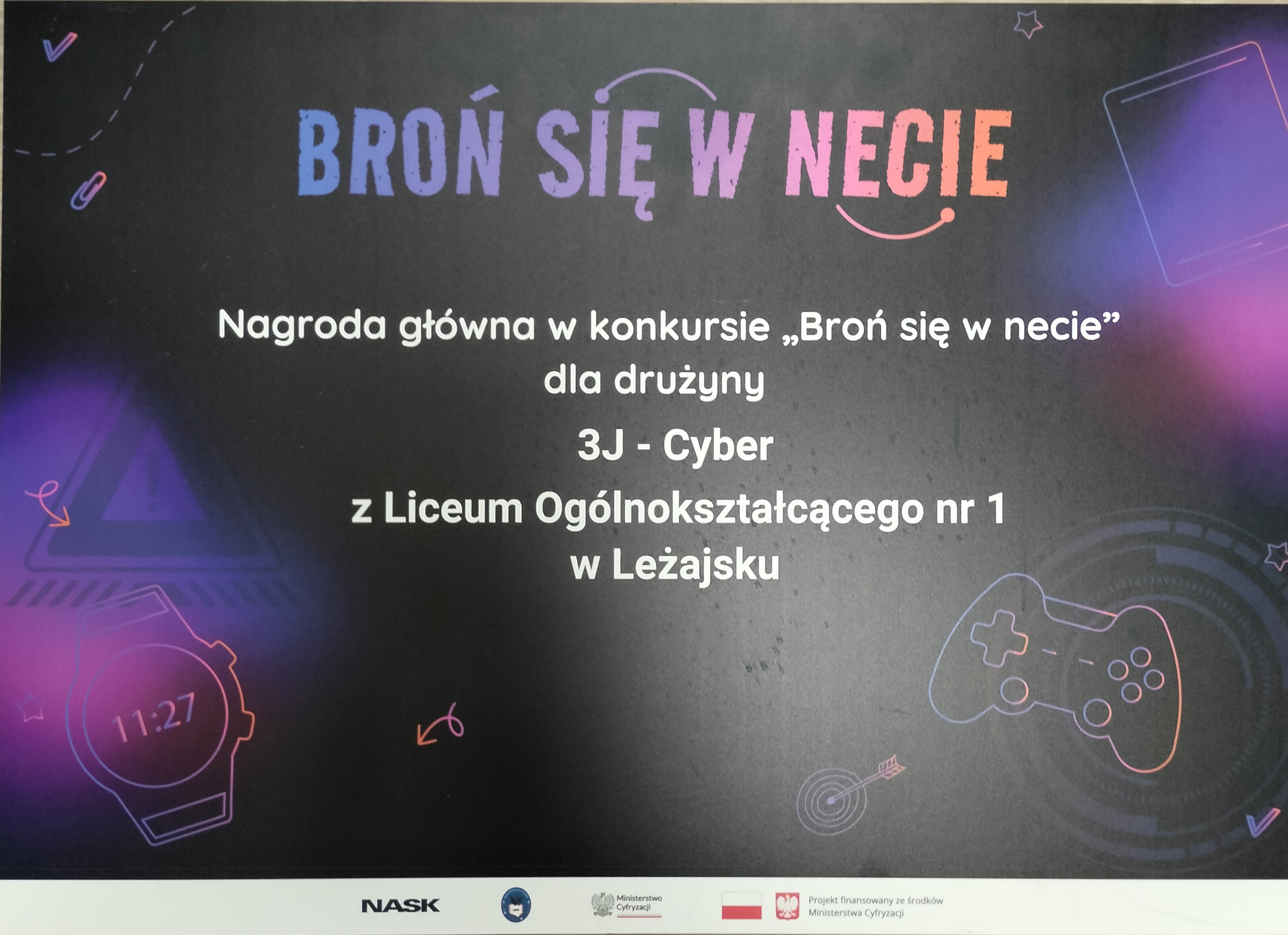 Z dumą informujemy, że uczniowie klasy 3j CYBER wzięli udział w ogólnopolskim konkursie „Broń się w sieci”, organizowanym przez NASK – Państwowy Instytut Badawczy.