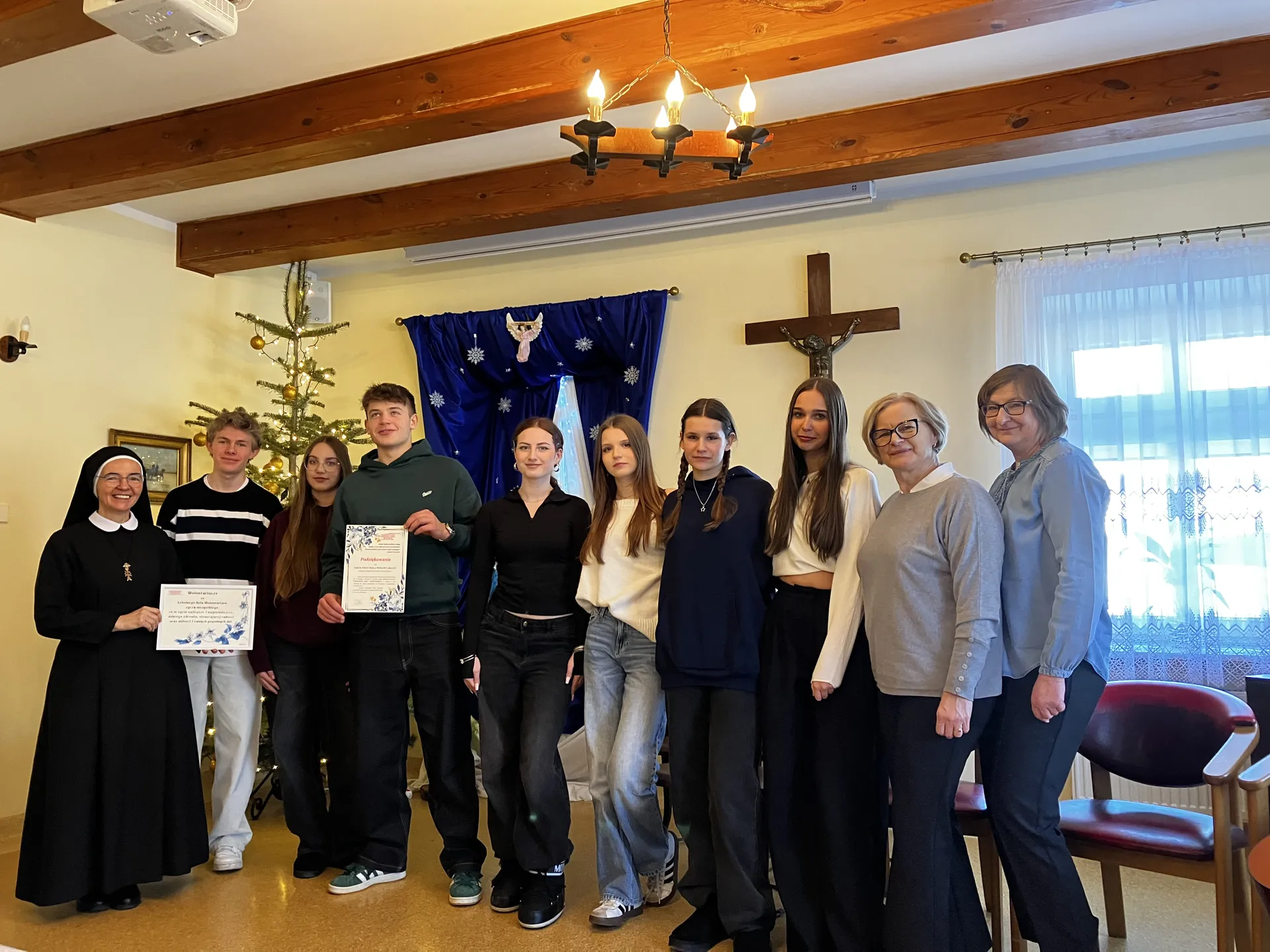 Młodzież z wielkim zaangażowaniem zaprezentowała koncert kolęd i pastorałek, który wzruszył pensjonariuszy i wypełnił ośrodek wyjątkową, serdeczną atmosferą. Po występie wszyscy wspólnie kolędowali, a uczniowie złożyli seniorom serdeczne życzenia z okazji zbliżającego się Dnia Babci, wywołując wiele uśmiechów i wzruszeń. Każdy z uczestników spotkania otrzymał pamiątkową kartkę z życzeniami, jednak najcenniejszym darem okazał się wspólnie spędzony czas. Ciepłe rozmowy młodzieży z pensjonariuszkami i ich opiekunkami stworzyły chwile bliskości, zrozumienia i prawdziwego międzypokoleniowego dialogu.